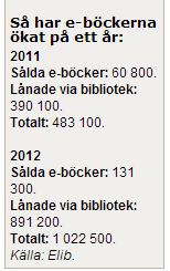 Det ska också bli intressant att se vad jag får betalt för varje bibliotekslån. I dagsläget kostar varje utlån biblioteken 20 kr varav Elib behåller hälften och den andra tian går till förlaget (vilket innebär författaren i de fall författaren driver förlaget). Det är i stort sett samma peng som vid en försäljning av en billig e-bok. För varje ex av Mina krönikor i Mölndals-Posten 2012 som säljs hos Dito för 29 kr tjänar jag 13,50 kr. Men från och med nyår ska Elib istället basera sin ersättning på procent av f-priset (vilket i det aktuella fallet är 15 kr).