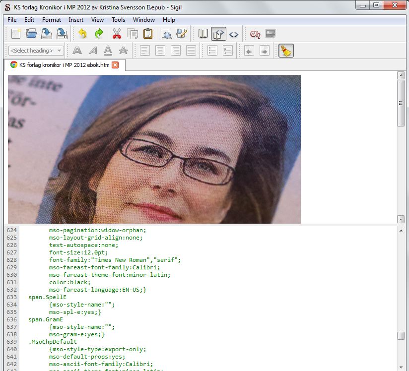 Utan att på något sätt ha trängt djupare in i e-böckernas mysterier så tror jag att Sigil är mer av en e-bokskodsredigerare. Nu har jag ägnat ganska mycket tid åt att titta på e-bokskod innan e-boken blev klar så det kanske var ett bra val.