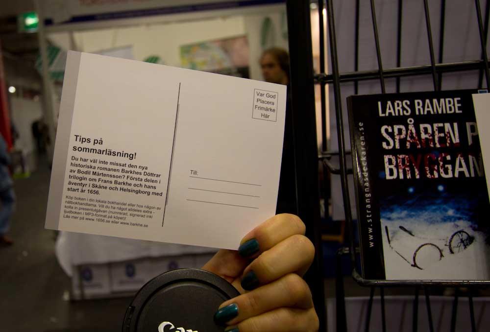 Ett av mina huvudprojekt på mässan är att spana in olika marknadsföringsknep. Här är ett snyggt vykort för en bok jag tycker låter himla intressant. Kommer nog gå hem med en (annars har jag lovat mig själv att inte gå hem med fler böcker än jag kom hit).