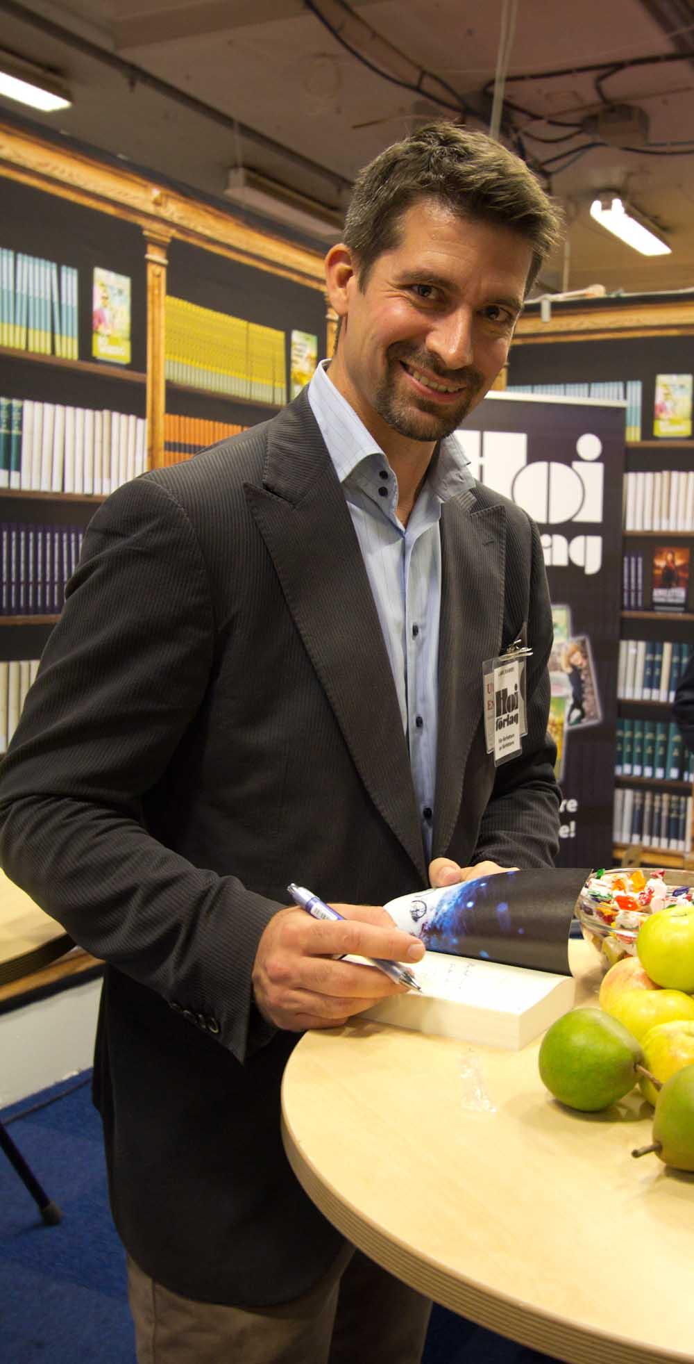 Lars Rambe har gått ut hårt och satt upp målet för mässan: han ska signera 1000 pocketböcker! Här signerar han nummer 42 (till min faster).