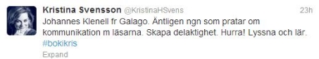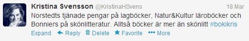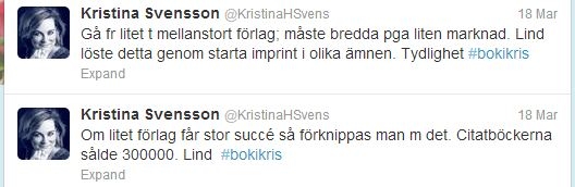 Bokmarknad i kris? arrangerades av Avdelningen för Litteratursociologi vid Uppsala universitet, De Oberoende och Riksbankens Jubileumsfond. Det var gratis, nästan 130 anmälda och ägde rum i Natur & Kulturs lokaler i Stockholm. Jag såg inbjudan fladdra förbi på twitter men det var först när Kaj Karlsson la upp länken i Egenutgivarnas forum som jag nappade. Jag var dock in i det sista tveksam till om jag skulle kunna delta eftersom det låg dagen efter WebCoast i Göteborg. Jag var mycket riktigt ganska sliten men att twittra var ett sätt att hålla ångan uppe samtidigt som det gjorde att jag kunde diskutera det som sas med andra i publiken.