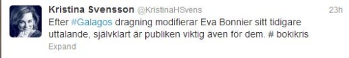 Jag tycker att det är signifikant att efter denna dragning kände sig Eva Bonnier föranledd att modifiera ett tidigare uttalande. Efter hennes föredrag frågade nämligen Anja Wikström om hur förlagen ser på läsarna. Wikström jämförde med läkemedelsbranschen; förr fokuserade läkemedelsbolagen på läkarna men idag är det patienterna som står i fokus. Bonnier avfärdade detta, relationen med läsarna får bokklubbarna och författarna sköta, förlagens uppgift är relationen med författarna.