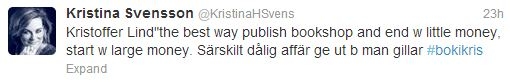 Kristoffer Lind inledde med att samla skratt genom ett citat om att säkraste sättet att skaffa sig en liten utkomst från bokutgivning är att starta med stora resurser och att han önskade att någon berättat detta för honom när han startade.