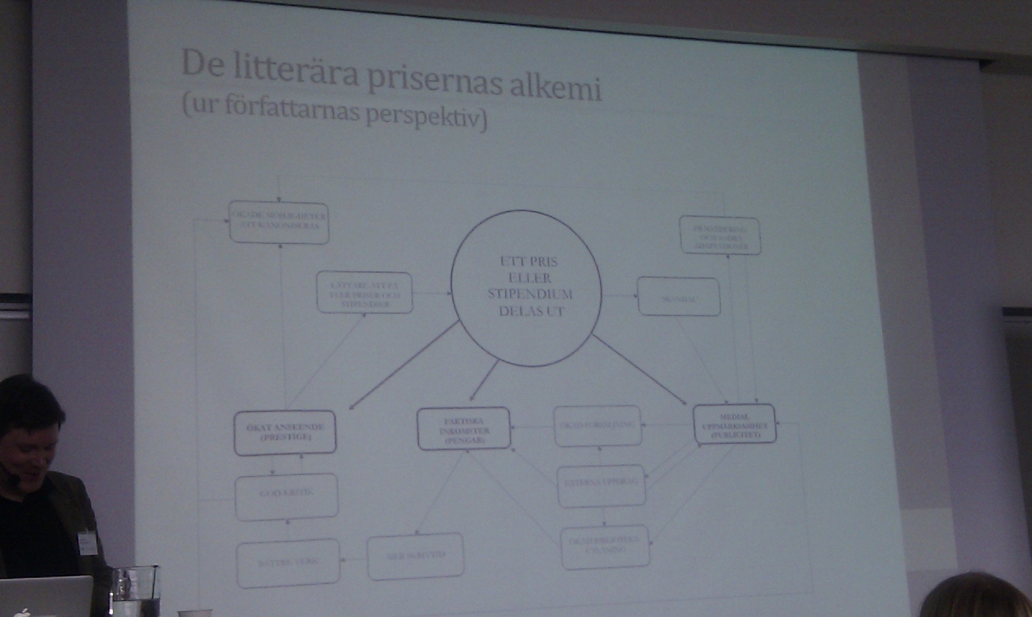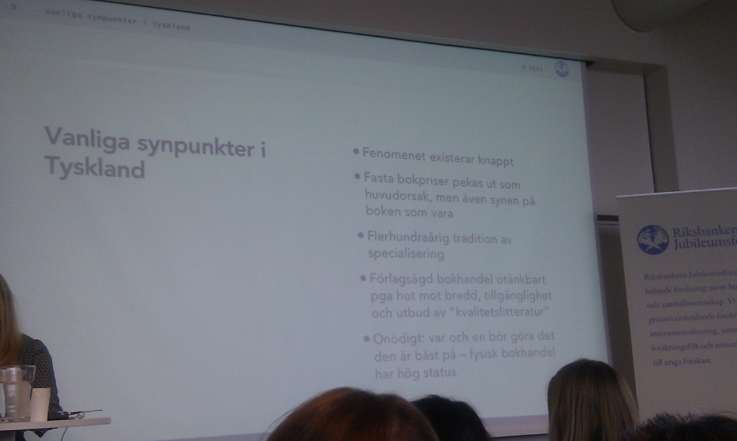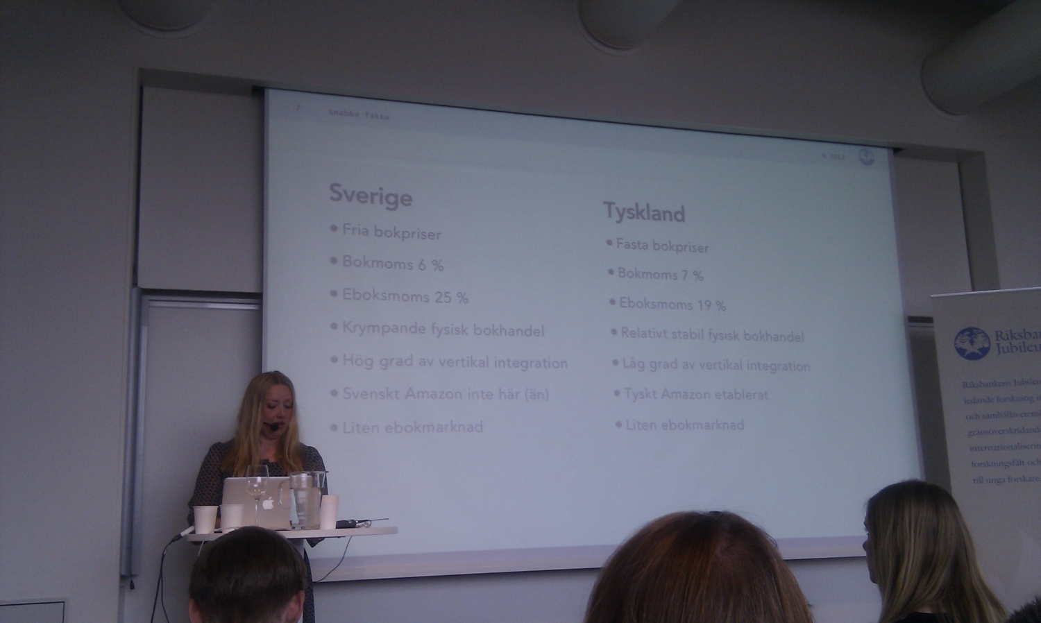 Efter lunch presenterade sex forskare eller doktorander från avdelningen för litteratursociologi något från sin forskning. Först ut var Anna-Maria Rimm som också arrangerat konferensen. Hon hade jämfört synen på vertikal integration i Tyskland respektive Sverige (typ att samma företag äger både förlag, media och bokhandlare).