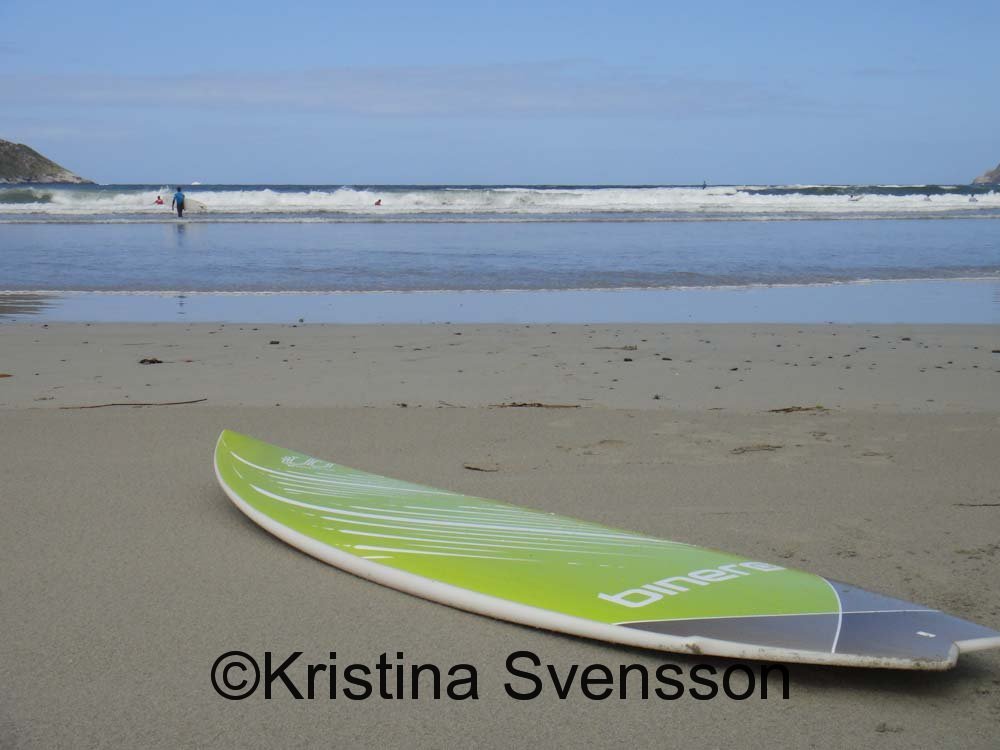 Idag tyckte jag det var dags att min snygga Binero-bräda fick se lite vatten. Förutom att den är mycket snyggare än alla lånebrädorna så är den mindre och lättare att bära ner till stranden (uppskattas!). Tyvärr visade den sig sakna både fenor och leach (snöret som gör att man har någon chans hålla reda på brädan i vattnet). Så min snygga bräda fick stanna på stranden :-(