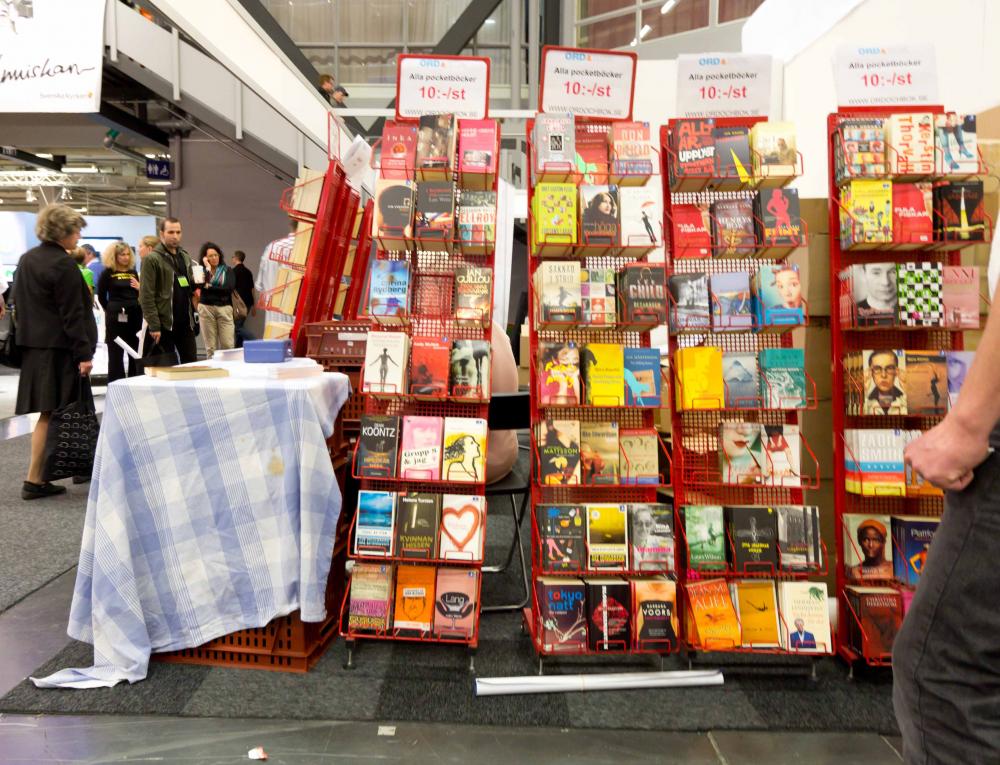 Pocketböcker för tio kronor. Jag har inga bevis men jag tror att på bokmässan är det följande som säljs mest: signerade böcker av kända författare, böcker till fyndpris samt stora vackra dregelböcker (coffee table, presentböcker – kärt barn har många namn). Och så är det en och annan som kommer dit och letar rätt på någon de känner och handlar denna persons böcker. Stort tack till alla som handlade min!