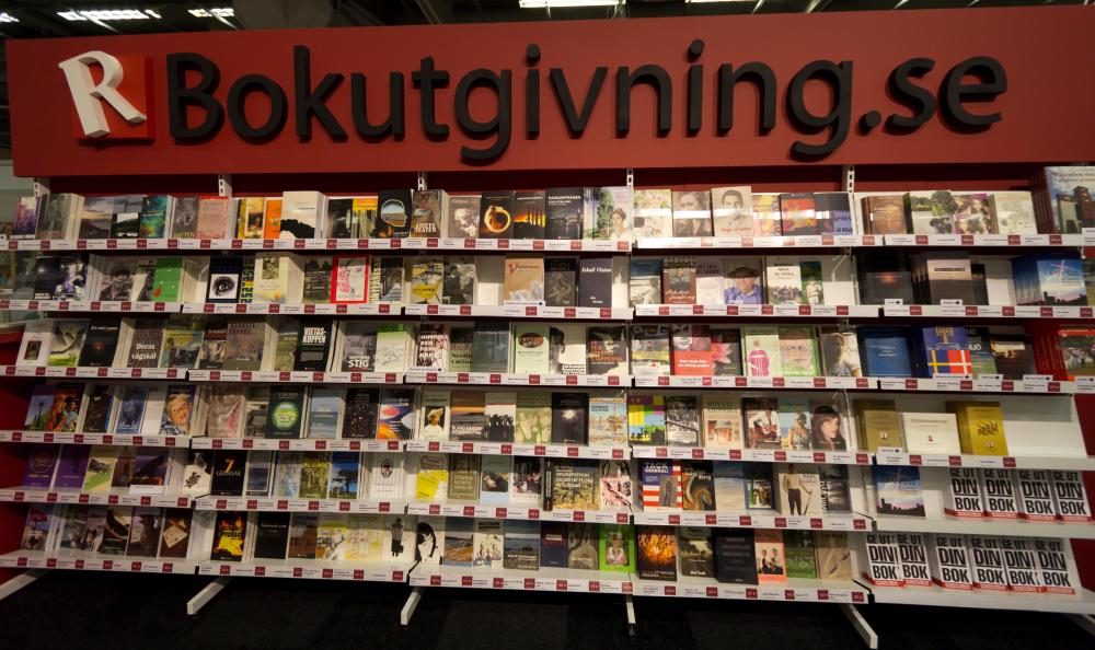 Det är många som ger ut sina egna böcker. Med tanke på att en av de stora drakarna under tio år gett ut 39 debutanter, medan de under samma tid fått in 14 000 manus, är det inte underligt att det blir många egenutgivna böcker. Det här är bara en av bokhyllorna hos Recito som jag tror är störst på POD-böcker. De jobbar aktivt med sociala medier.