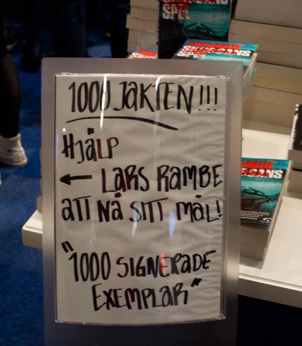 Lars Rambes jakt på 1000 signeringar har jag redan skrivit om i torsdagens inlägg. Hur det gick? Jo Lars signerade alla böcker som fanns. (Men då en lastpall med böcker fick fötter kom han inte riktigt upp i tusen – och sparade eventuellt handen från skrivkramp). Det var nära att han inte kunde signera alls, han la nämligen ifrån sig sin specialpenna i Hoi:s monter. Där fick jag syn på den, lånade den för en av mina signeringar, upptäckte att den var riktigt bra och försökte sno den.