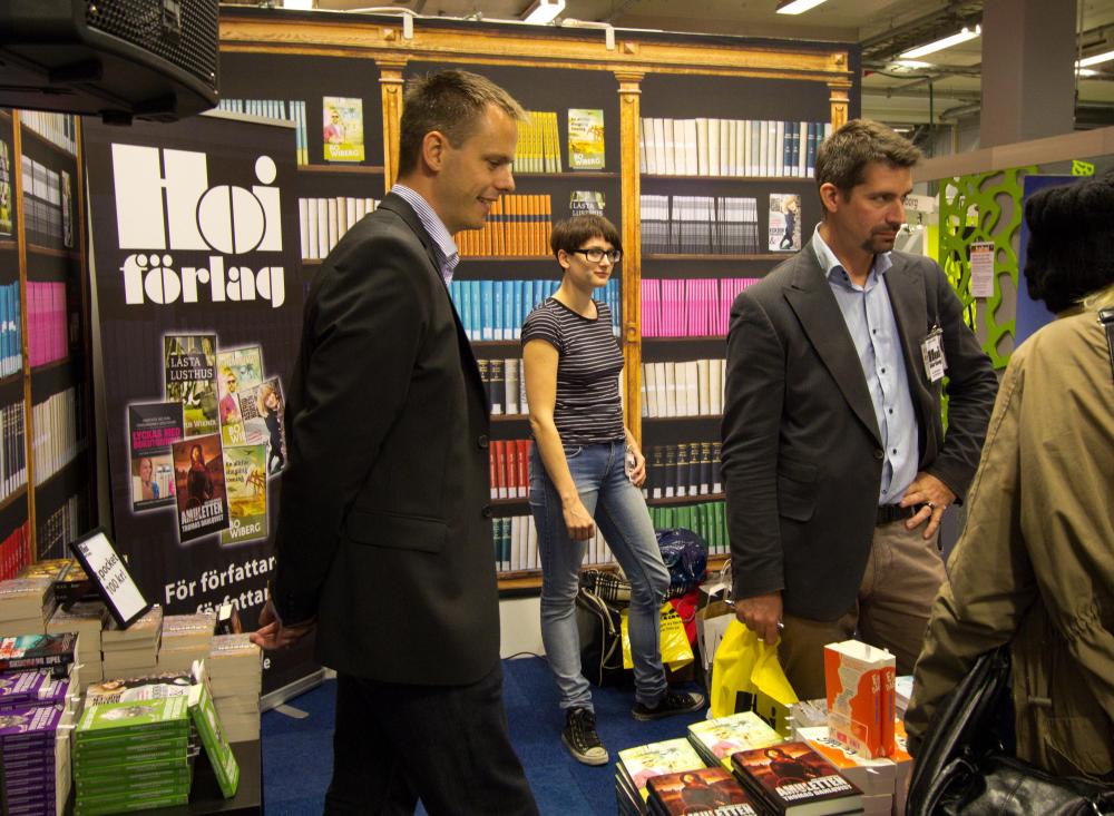 Lars Rambe, Erika Söderström och Sölve Dahlgren i Hoi:s monter. Det jag gillar med den här montern är att specialdesignade vepor täcker hela väggarna, det ger ett proffsigt och sobert intryck. Sedan är det en fördel att ha en hörnmonter. Montern är också öppen utåt, det gör det lätt för besökarna att slinka in och titta på böckerna (det är inte en disk mellan besökarna och författarna).