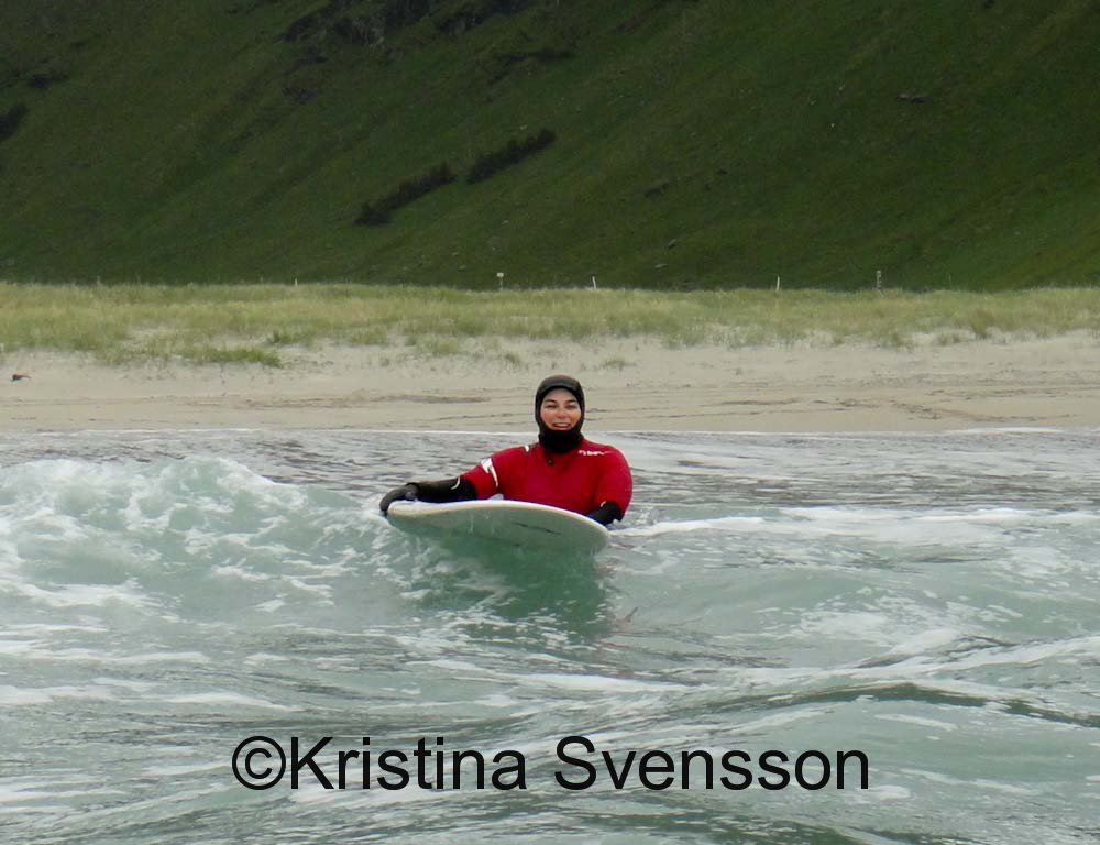 Punkten jag fasat för kom närmare och närmare. Jag stod i vattenbrynet och såg på de höga vågorna och funderade på om det verkligen verkligen var nödvändigt att ge sig av ut. Jag har aldrig någonsin ens övervägt hoppa i vattnet när det är ens hälften så höga vågor. Men jag är ju envis och tänkte jag skulle prova i alla fall. Gick ut några steg och nu var det tänkt att man skulle lägga sig på brädan och paddla ut. Men lägga sig med huvudet rakt mot vågorna – nä det vågade jag inte. Sedan en crawlkurs för några år sedan får jag panik om jag får vatten i ansiktet (typ vågstänk eller huvudet under vattenytan) – snacka om begränsande för en surfkarriär!