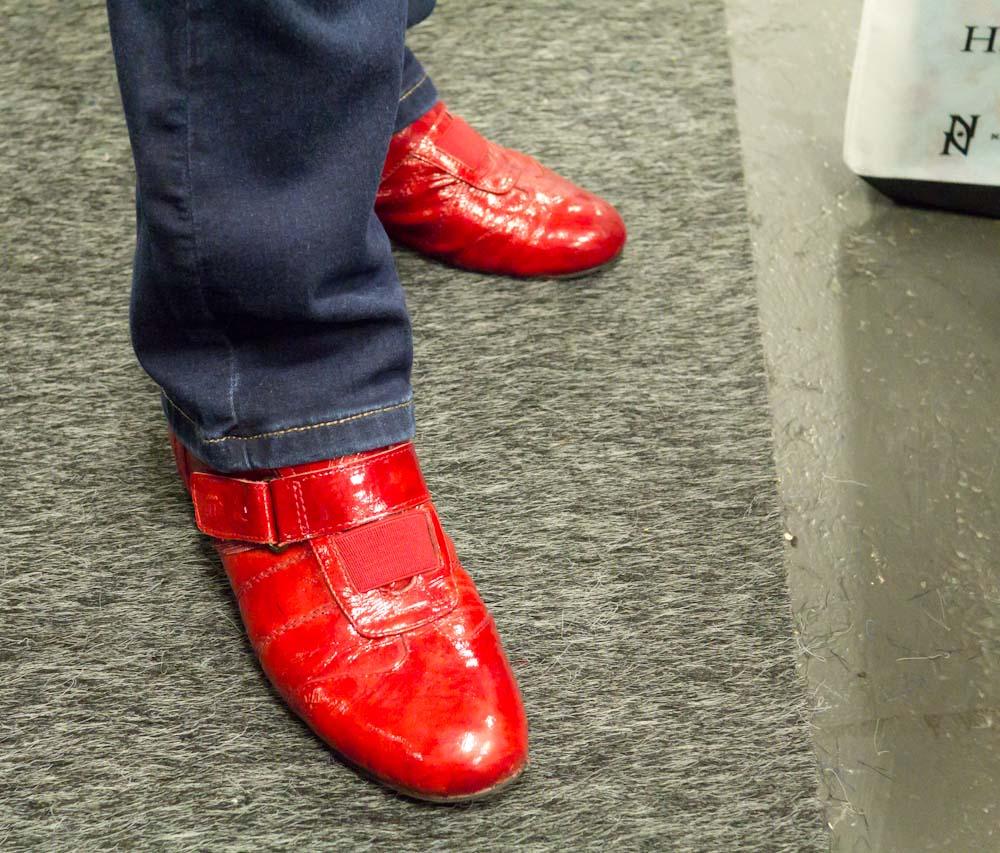På tal om färg och kläder, Annika Åkervall har som sitt signum att alltid klä sig i rött, orange eller cerise. Hon har givetvis även mässanpassade skor i denna färg. (Mina skor ska vi helst inte orda så mycket om.)