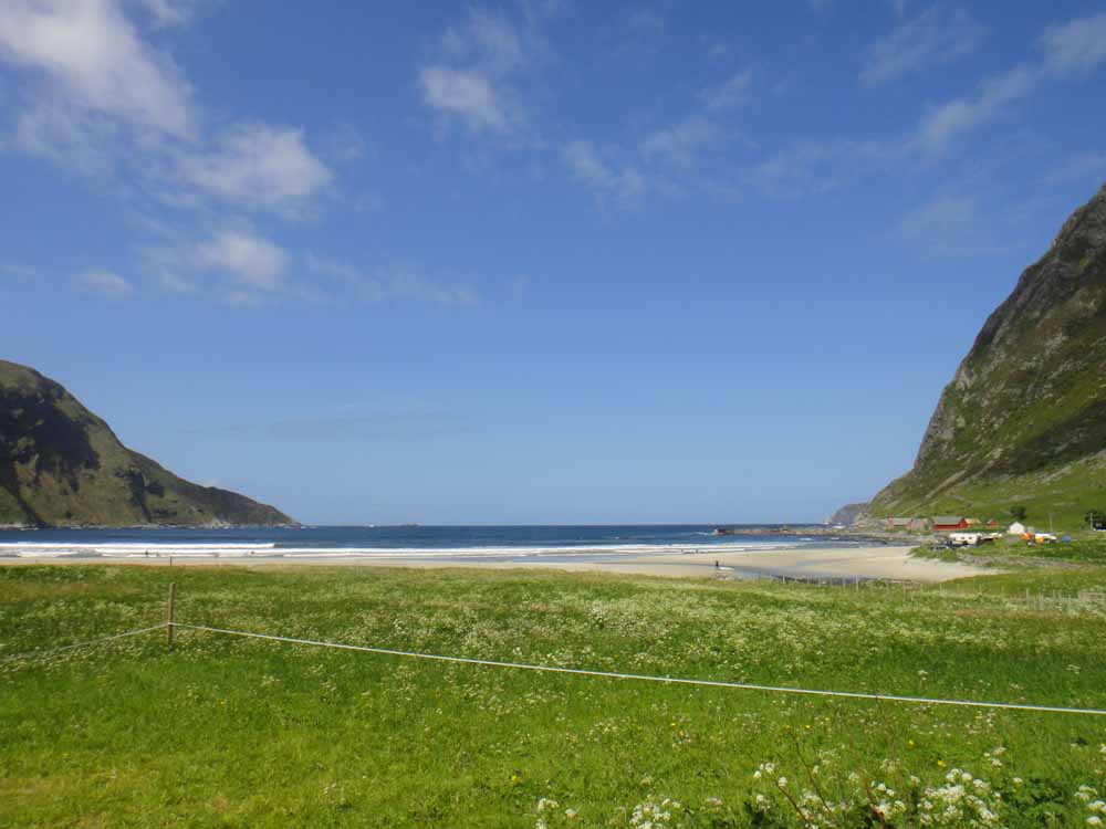 Hoddevik består praktiskt taget bara av en kilometerlång sandstrand inklämd mellan 500 meter höga berg fulla med mer eller mindre lättfotade djur. Till höger anas en camping och ett annat surfcamp. ”Vårt” surfcamp låg en bit högre upp i dalen.